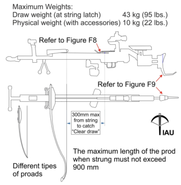 - Die Feldarmbrust muss von Hand ohne Hilfsmittel von mechanischen Geräten (intern/extern) oder Fingerschutz irgendwelcher Art gespannt werden.